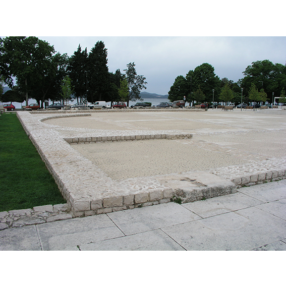 Entlang der südwestlichen, längeren Seite des Forums, befand sich im römischen Zeitalter eine monumentale Stadtbasilika, die auf das Ende des 2. Jh. und den Anfang des 3. Jh. datiert. Die Basiliken spielten eine vielfältige Rolle, sie waren ein Treffpunkt für das Volk während der Handelsgeschäfte, aber sie waren auch Gerichtssääle. Die Basilika war 73 Meter lang und 27 Meter breit. Sie hatte drei Seitenschiffe, von welchen das mittlere Seitenschiff auf der östlichen und westlichen Seite in einem erhobenen Podest (tribunal) endete, von welchem aus die Stadtbeamten mit dem Volke kommunizierten. Der mittlere Teil der Basilika wurde gröβtenteils beim Bau des venezianischen Sammelbrunnens zerstört.